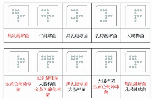 圖二、生乳微生物檢驗晶片晶片規格與結果讀取。傳染性乳房炎菌種以紅色字體顯示。