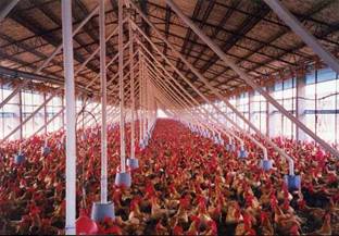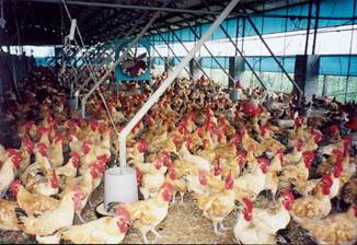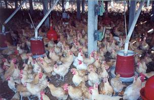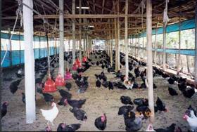 紅羽品系4場內檢定公雞舍內。此場進雛12000隻,採公母分飼,平均每坪約養40隻。飼養者除平日之飼養管理外,雞隻之防疫及剪喙工作均請專人負責,飼養管理良好。檢定期間雞舍內通風良好,雖缺乏運動場但因雞隻飼養至10.5週即開始出售,且至12.5週即全部出售結束,故對雞隻運動之影響較小。