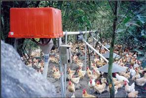 紅羽品系2場內檢定母雞舍內。此場進雛19400隻,採公母分飼,飼養者之飼養管理良好,雞隻約8-9週齡後即將雞舍下緣鐵絲網拆下,讓雞隻自由進出雞舍與戶外運動場之間,惟戶外運動場不大。檢定期間雞舍通風良好。雞隻飼養至12週即開始出售,至13週即全部出售結束。