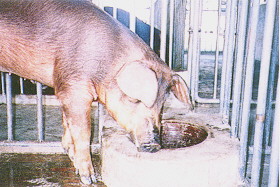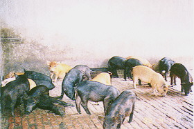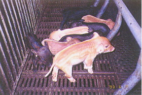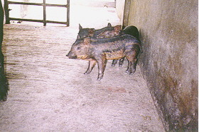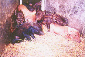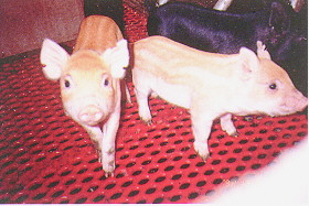 雜交仔豬呈紅棕色和黑色相間條紋體色
