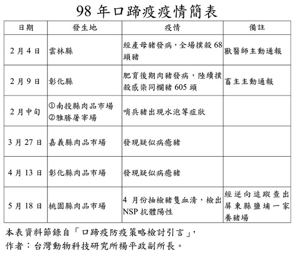 台灣動物科技研究所楊平政副所長在「口蹄疫防疫策略檢討引言」中,就98年初以來發生的六起零星疫情分析,指出「在疫情源頭上無法找到感染源」、「養畜戶未主動通報疫情」,這都是防疫上很大的漏洞。