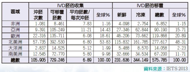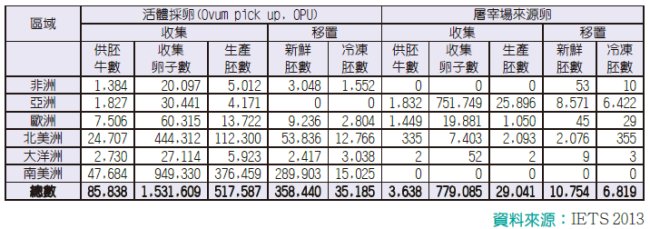 表2.2013年全球各洲收集與移置的IVF(體外胚)牛胚數 |