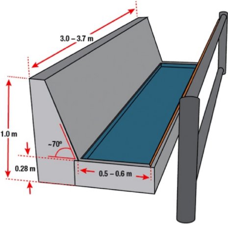 關於蹄浴槽的設計,有部分酪農認為隧道式蹄浴槽(圖2與圖3)或較高側壁設計的蹄浴槽的使用效率較佳,如此的設計有較好的牛隻動線,並更容易維持蹄浴槽的乾淨,因此增加每次蹄浴使用的牛數。為達到良好有效的蹄浴計畫,蹄浴槽長度為305-366公分,寬度為26-31公分,兩側壁要有防止乳牛側踏的設計。此外,蹄浴藥品的選用是另一項絕對影響成敗的因素。學者認為,大多數蹄浴產品很少甚至沒有進行嚴謹的實驗瞭解病原微生物對於趾間皮膚炎的長期影響,因此學者目前還是推薦使用硫酸酮做為蹄浴計畫的首選藥品。
