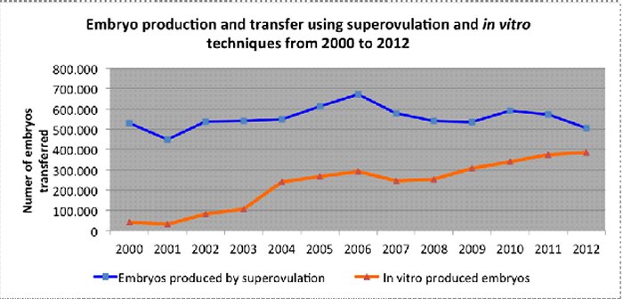 OPU和胚胎生產技術的應用正在逐漸增加中:根據過去十年的資料顯示,從2000年轉移的30,000個胚胎到2012年的400,000個胚胎增長近13倍。超級排卵部分自2000年起轉置產生的胚胎數量(約520,000)逐漸增加,直到2006年隨後減少並在2009年回到基準線水平。這統計數據顯示,2000至2012年間,體內產生的胚胎數量大致維持(藍線)。而體外生產的胚胎數量增加了約13倍,從2000年的30,000增加到超過400,000(橘線),顯示胚胎之體外生產技術的應用越來越多,未來OPU技術結合IVF及ET已是國際性趨勢。