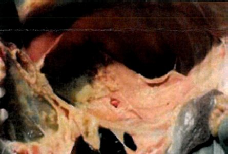 傳染性山羊胸膜肺炎(CCPP)微黃纖維蛋白 沉積的肺和粘連的表面上