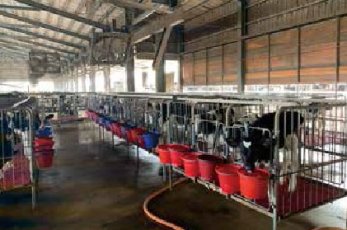 index, TPI)排名前30∼40名之美國及加拿大精液為主,九成牛隻配種使用選性精液,但配種2次以上仍未配上之牛隻則改為使用一般精液,由此可見許大哥對於育種的堅持與用心,長期選拔下來可看到許大哥的牧場乳牛群體型較大且相當一致,當然在牛群乳產量也是相當高。許大哥分享其牧場在分娩前後牛群護理部分,除飼糧中添加陰離子鹽,產後提供舔磚增加母牛嗜口性外,如產後食慾不佳者會適度給予丙二醇,以減少酮症發生。牛群擠乳作業目前由許先生及家人負責輪流進行,擠乳時間約為清晨4點及下午4點,每次約進行2個小時左右。擠乳室設計以2*8魚骨式設計,除動線設計非常順暢外,擠乳室採光與通風都相當舒適,擠乳等待區的地面也貼心地鋪設軟墊,除可避免牛群在發情騎乘時滑倒受傷也可減少牛群站立時腳蹄壓力(圖9)。為在夏季舒緩牛隻熱緊迫,除了畜舍高挑太子樓設計外,畜舍內每隔5公尺加裝大型風扇及於頸夾上方配置灑水系統。
