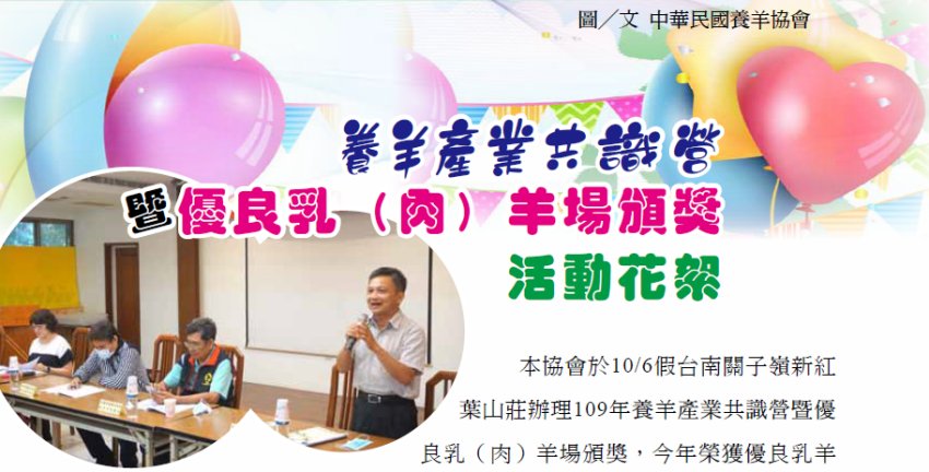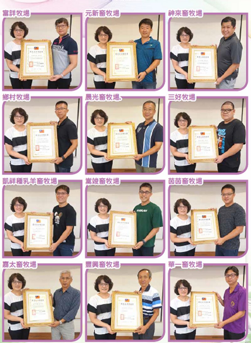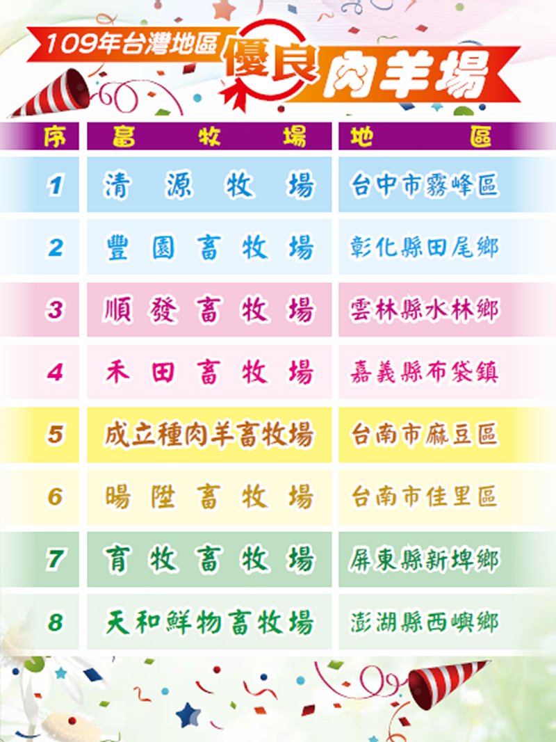 場有12場(詳如名單),榮獲優良肉羊場有8場(詳如名單),另有富詳牧場、華一畜牧場及育牧畜牧場等3場,連續3年(107~109年)評鑑榮獲為優良乳(肉)羊場,獲頒白鐵橫匾一式,以茲嘉獎鼓勵。
