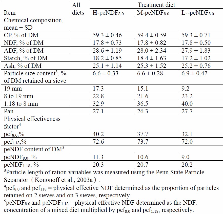 本篇試驗假設:在不調整飼糧粗精比的前提下,於一定範圍內透過增加顆粒尺寸而非增加NDF含量以提高精料飼糧的peNDF含量,可為有效減少SARA發生的方法。試驗選用泌乳中期的荷蘭牛為對象,3種處理組皆使用相同TMR配方,其營養成分皆相似,各處理組間的差別以賓州四段篩之上、中及下層含量區分,H-peNDF組各層含量為17.3%、22.8%及32.9%;M-peNDF組為15.1%、21.6%及36.5%;L-peNDF組為9.2%、23.2%及40.0%,H-peNDF組、M-peNDF組及L-peNDF組之中層peNDF含量各為11.3%、10.6%及9.0%,其餘項目詳如表1。